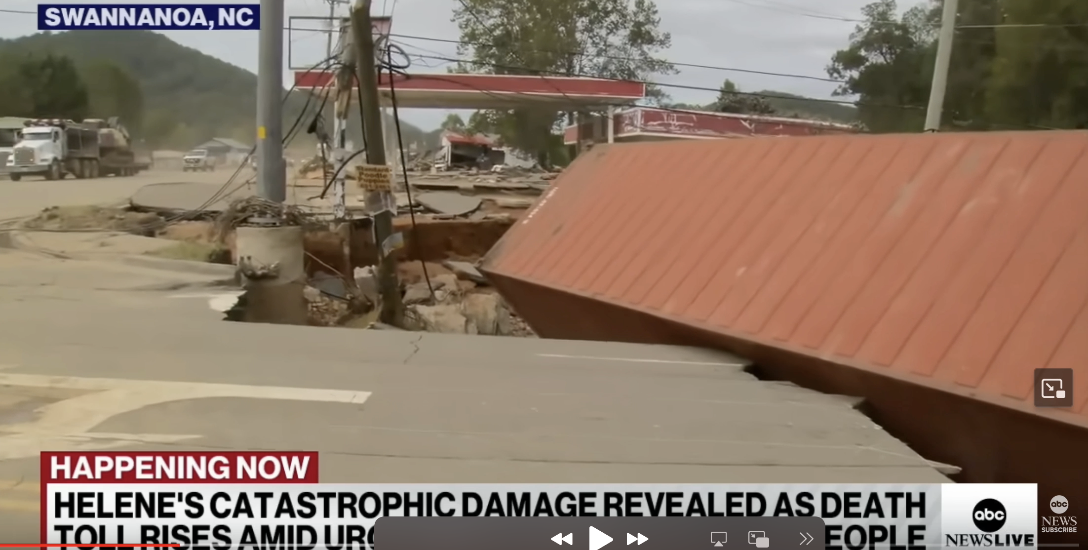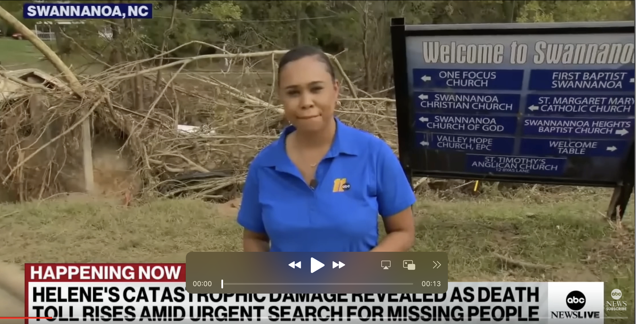 Today, just before I found the video linked above, I watched one from an ABC News affiliate covering Asheville, NC… and the small town of Swannanoa, NC…which is outside of Asheville. In that video, she starts by standing next to the town sign.